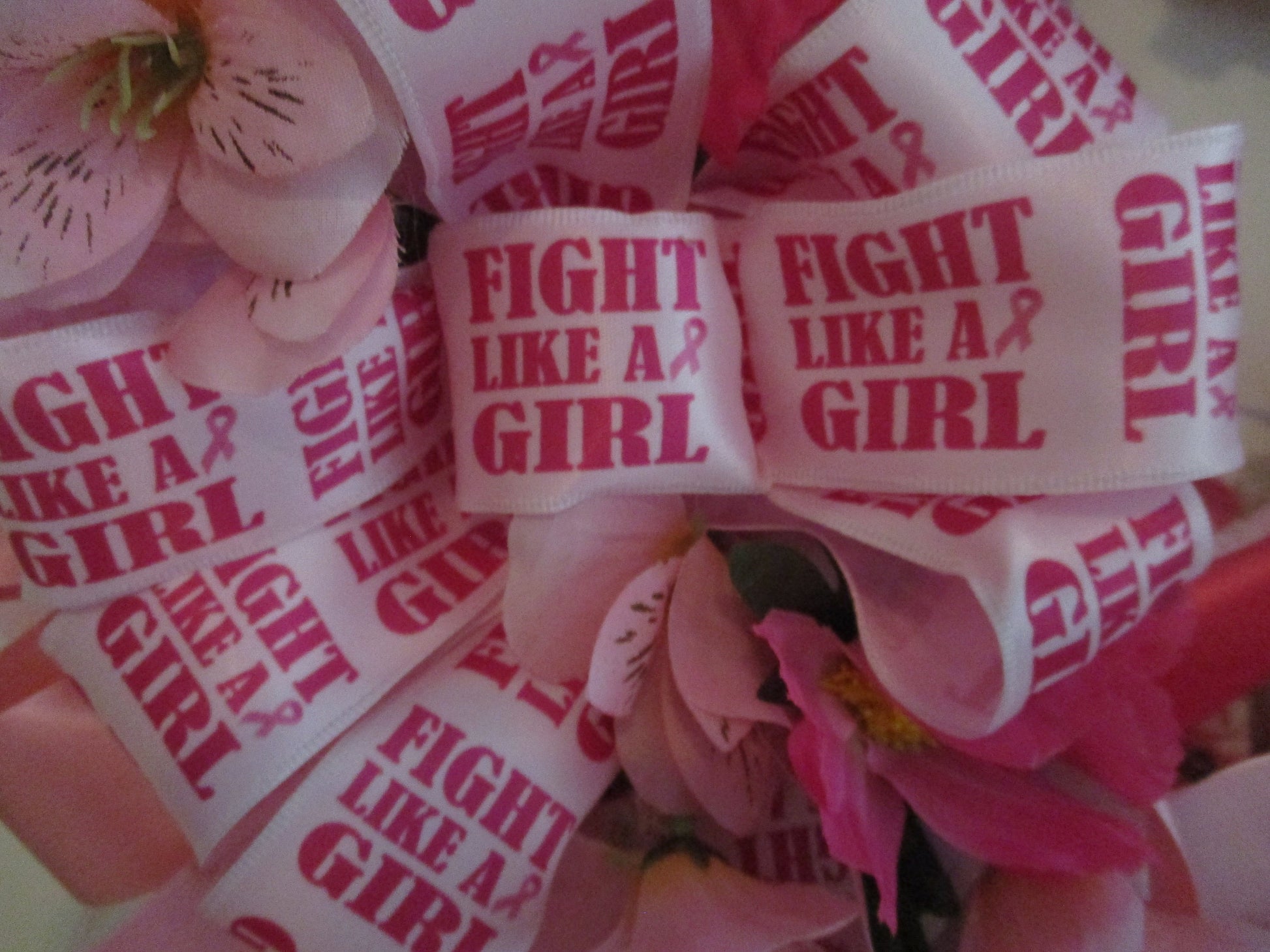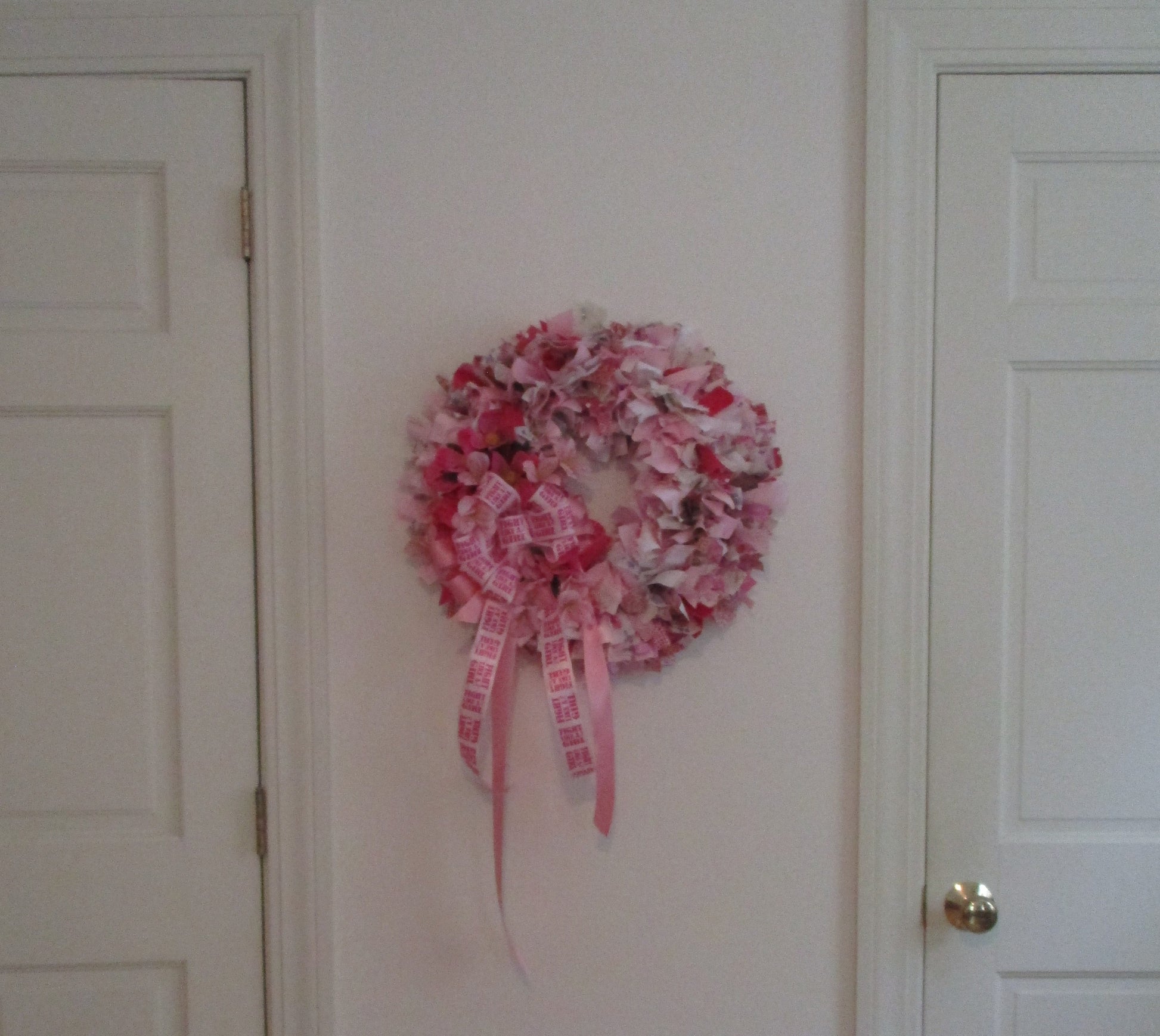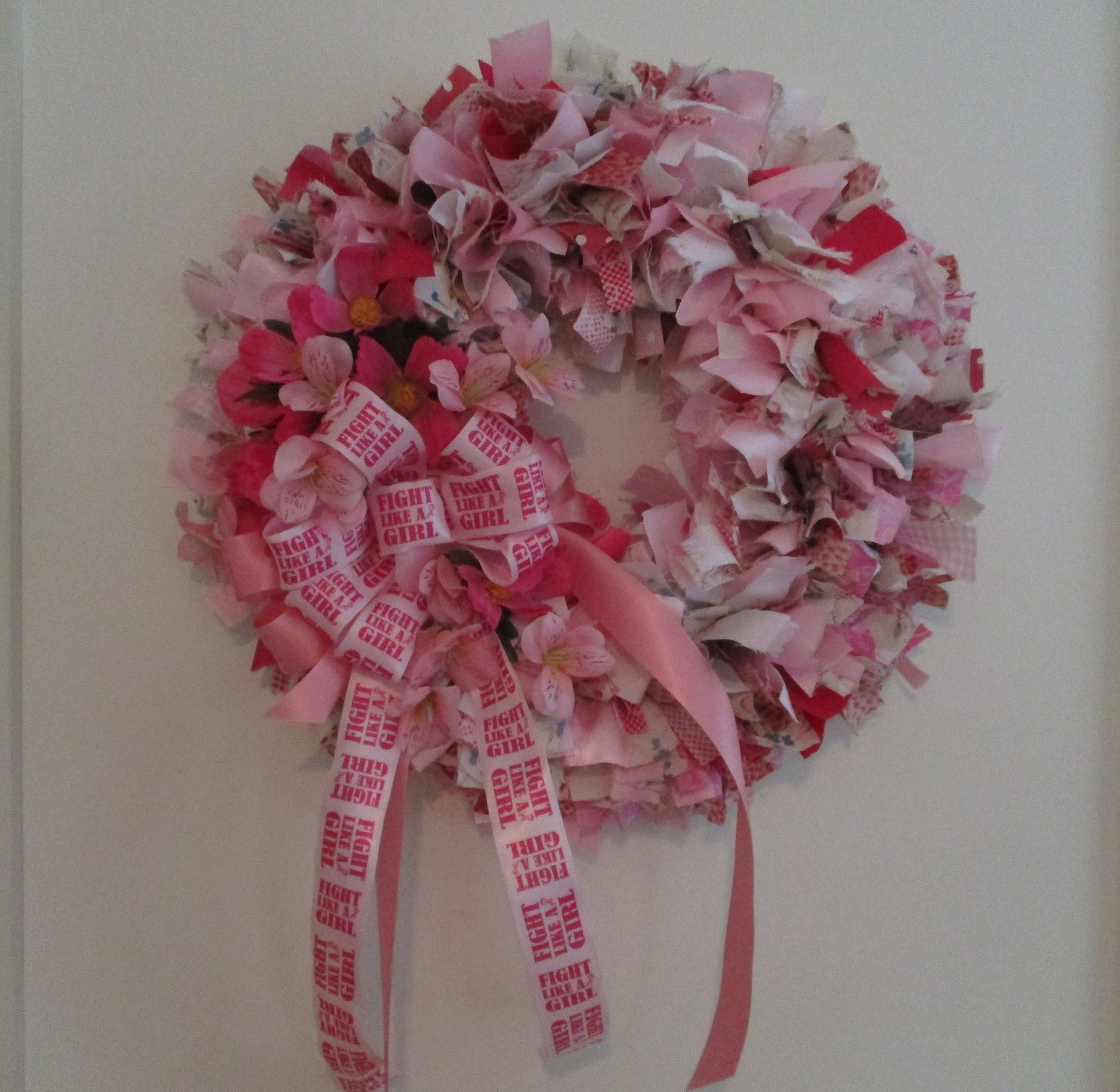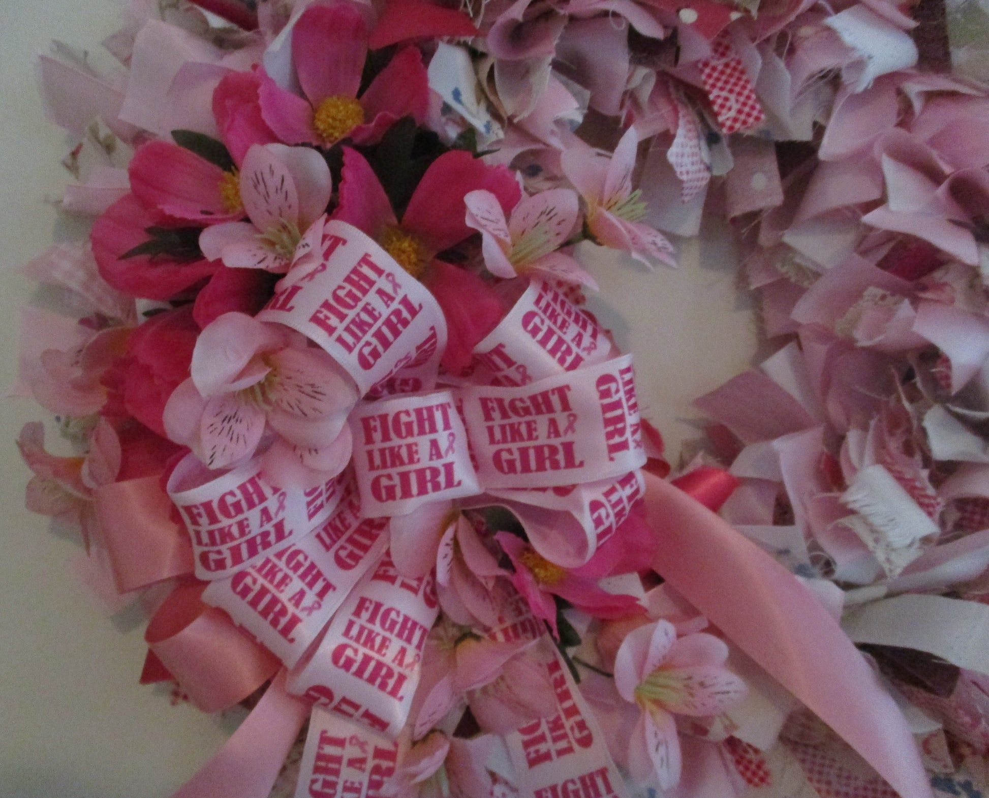 Breast Cancer Awareness Rag Wreath in Pinks and Whites for October Free Shipping