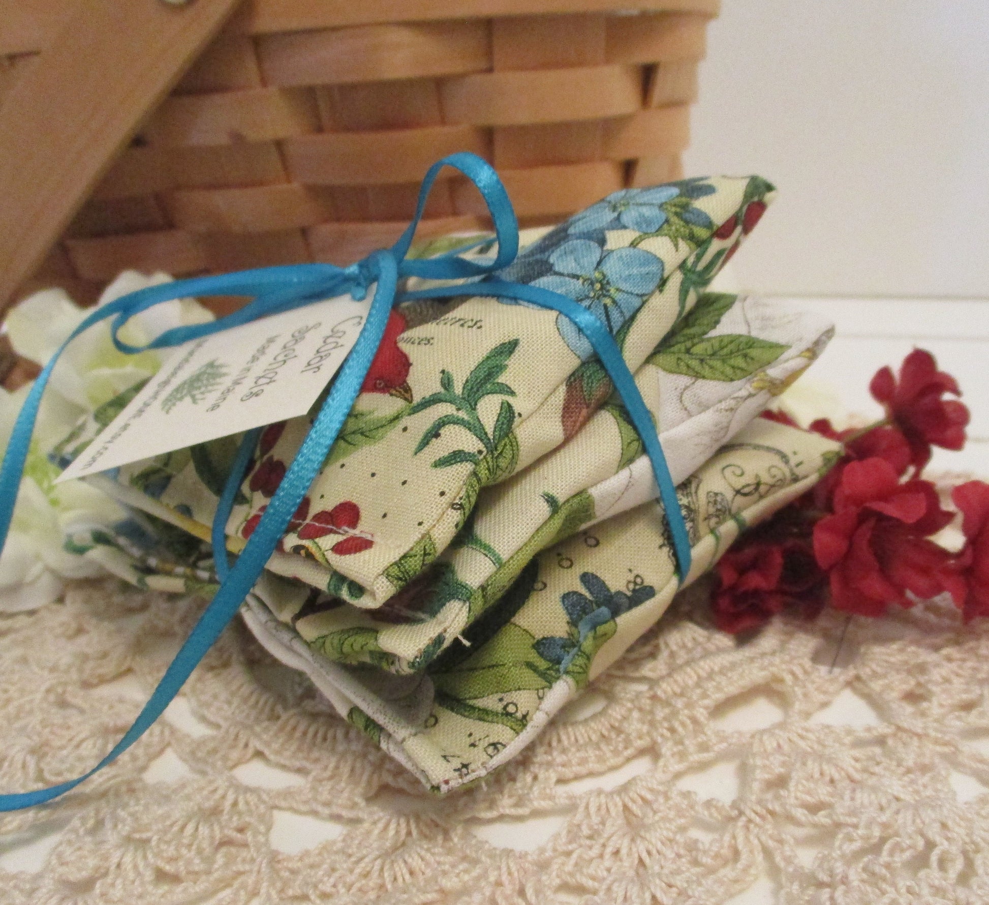 These sachet pillows can be filled with your choice of fragrant Cedar, Lavender, or Maine balsam fir (no fillers). This set of 3 features fabric with a beautiful natural floral design with flowers, birds, and butterflies. They are perfect for a small hostess gift, housewarming basket, or just to tuck in your own drawers or display around your home. Each pillow measures about 3 inches square and comes tied with satin ribbon and a Maine Made tag (scent appropriate), ready to give as a gift.