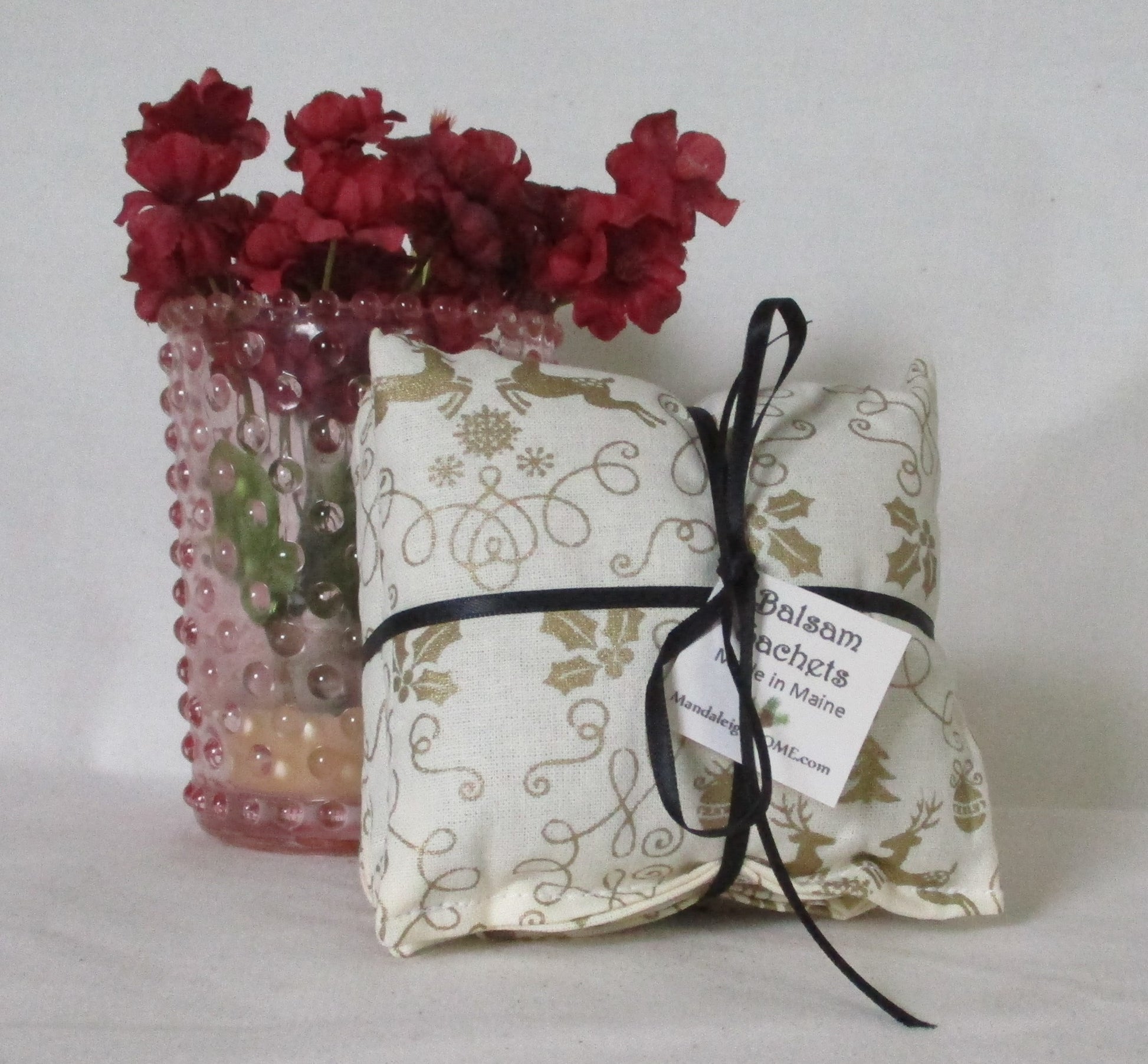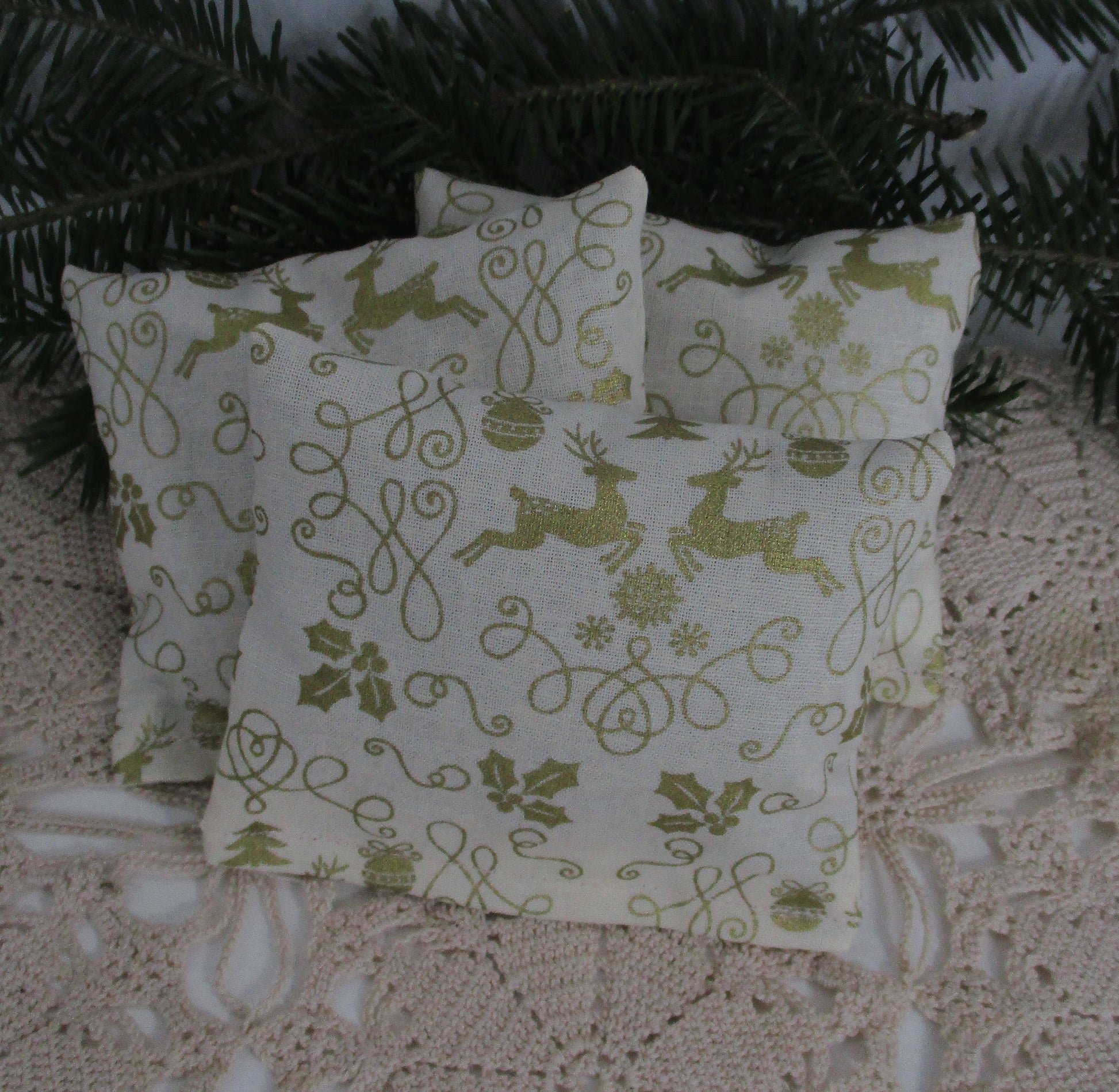 Decorate your cabin with these reindeer sachets. The cotton fabric features a printed motif of reindeer and ornaments in Gold on White background. The sachet pillows are filled with your choice of fragrant Maine balsam fir, lovely lavender or cedar shavings. Whatever scent you choose, they will be sure to be a wonderful accent for your home or a lovely gift for someone you care about. All three options have a wonderful smell and excellent insect repelling qualities. They are perfect for a small hostess gift, housewarming basket, or just to tuck in your own drawers or display around your home. Each pillow measures about 3 inches square and the set comes tied with satin ribbon and a Maine Made tag, ready to give as a gift.