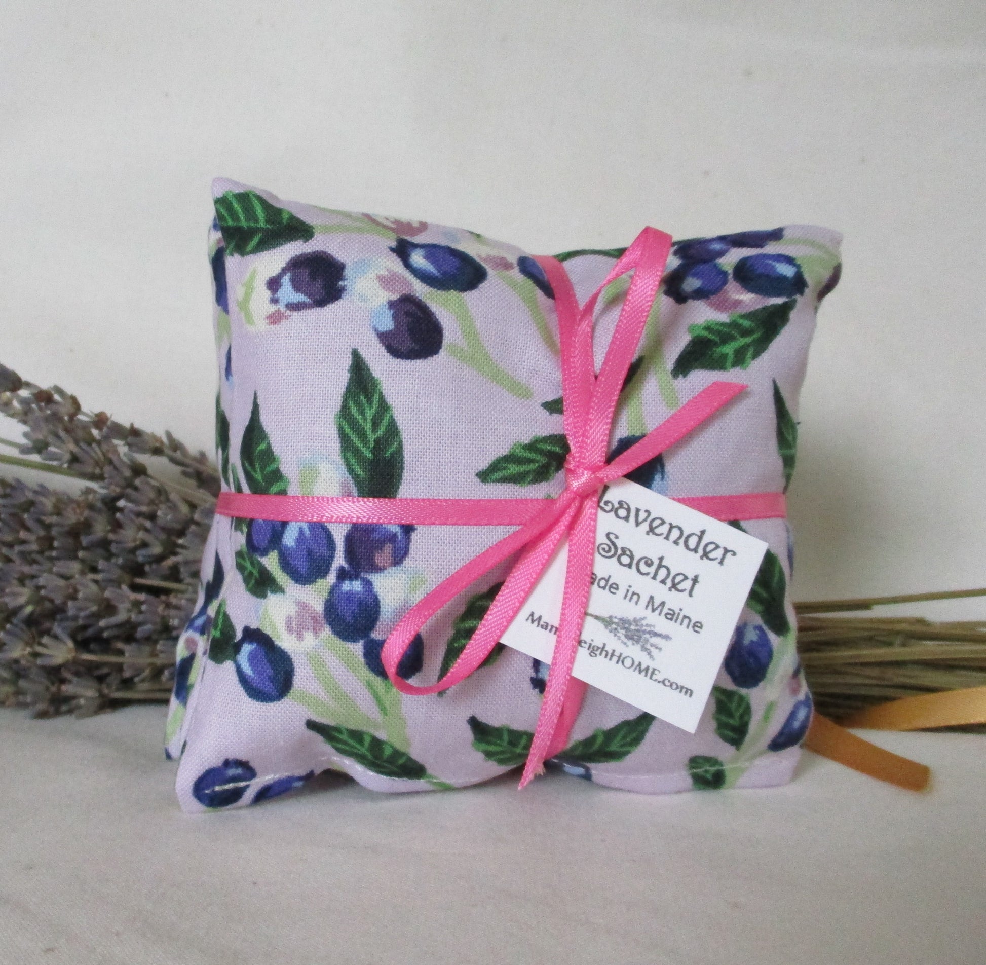 These sachet pillows are filled with fragrant Maine balsam fir. They are perfect for a small hostess gift, housewarming basket, or just to tuck in your own drawers or display around your home. Each pillow measures about 3 inches square and comes tied with satin ribbon and a Maine Made tag, ready to give as a gift. The sachet's are in blueberry fabric, and you have your choice of light green, lavender (shown in first photo), white, or light blue.
