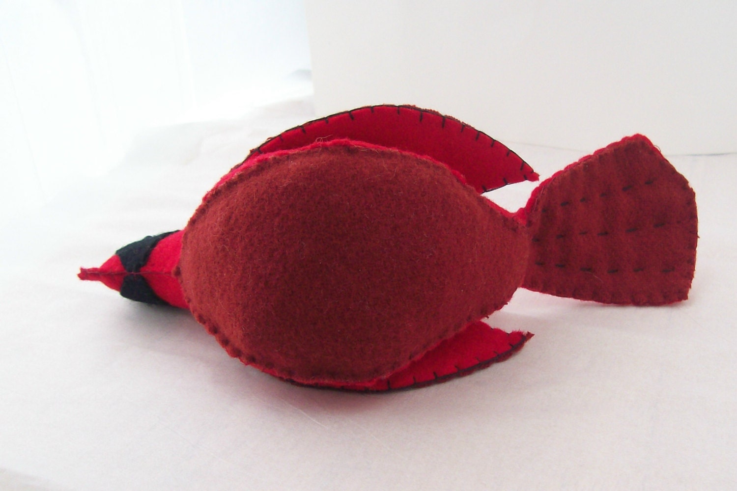 This Male Cardinal is a beautiful bright red bird perfect for play or display. He measures 9 inches long, 5 inches tall and 3 1/2 inches wide. He is made with both wool felt and eco felt (made from recycled plastic bottles) and is entirely hand stitched. He has bright black bead eyes, so please give to children older than three =)