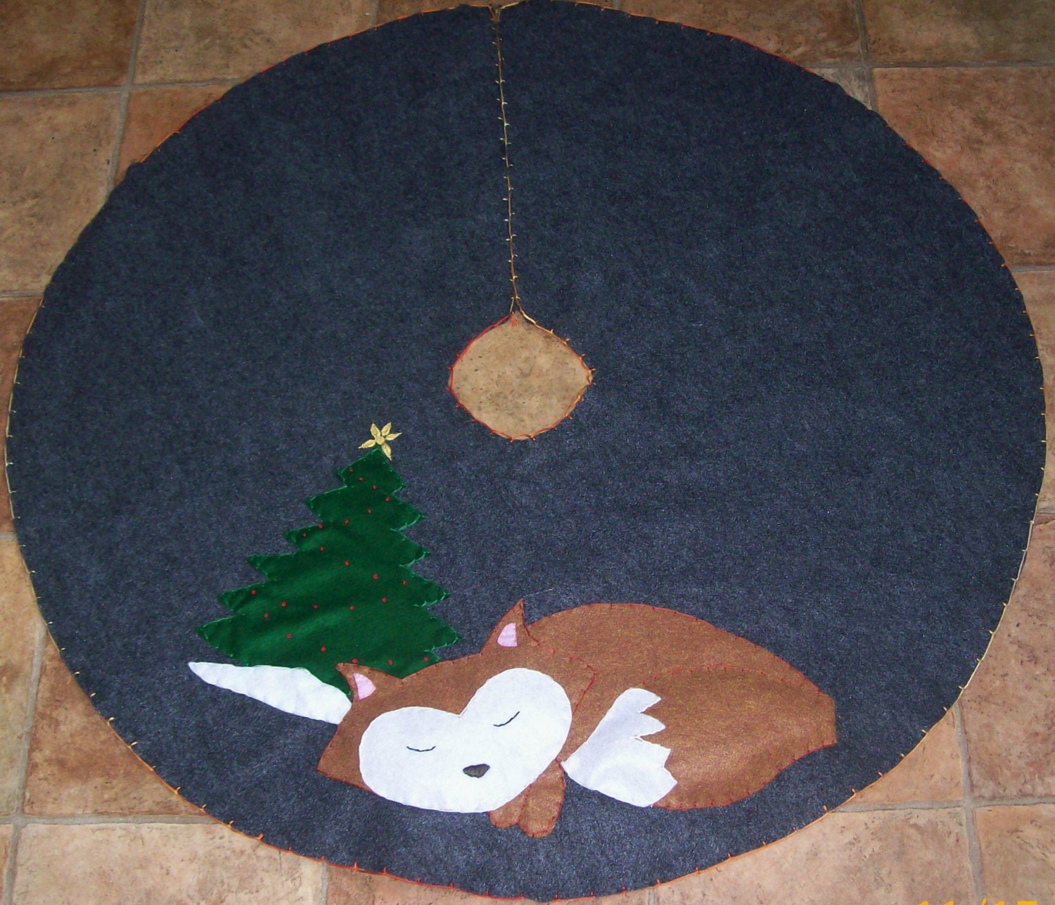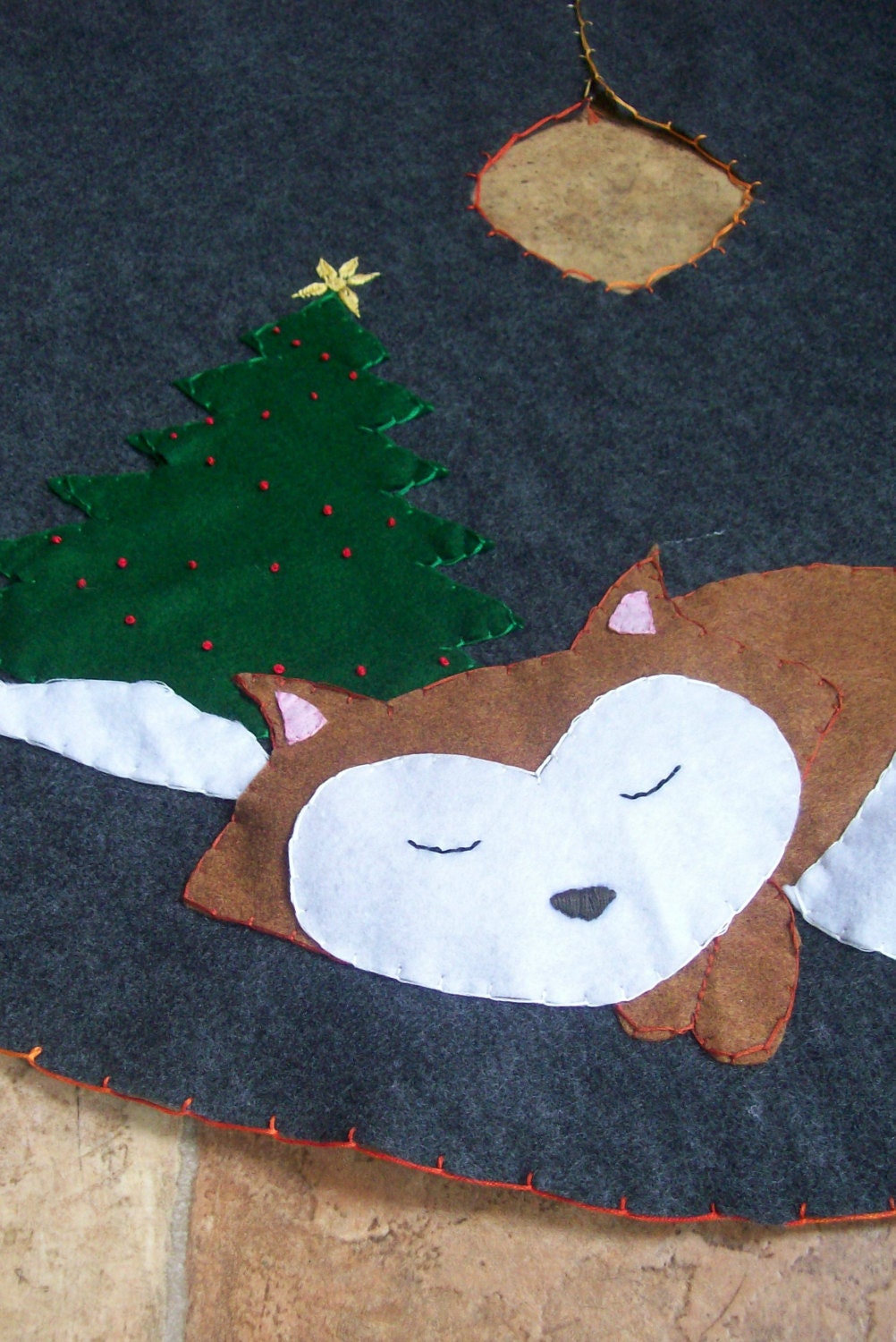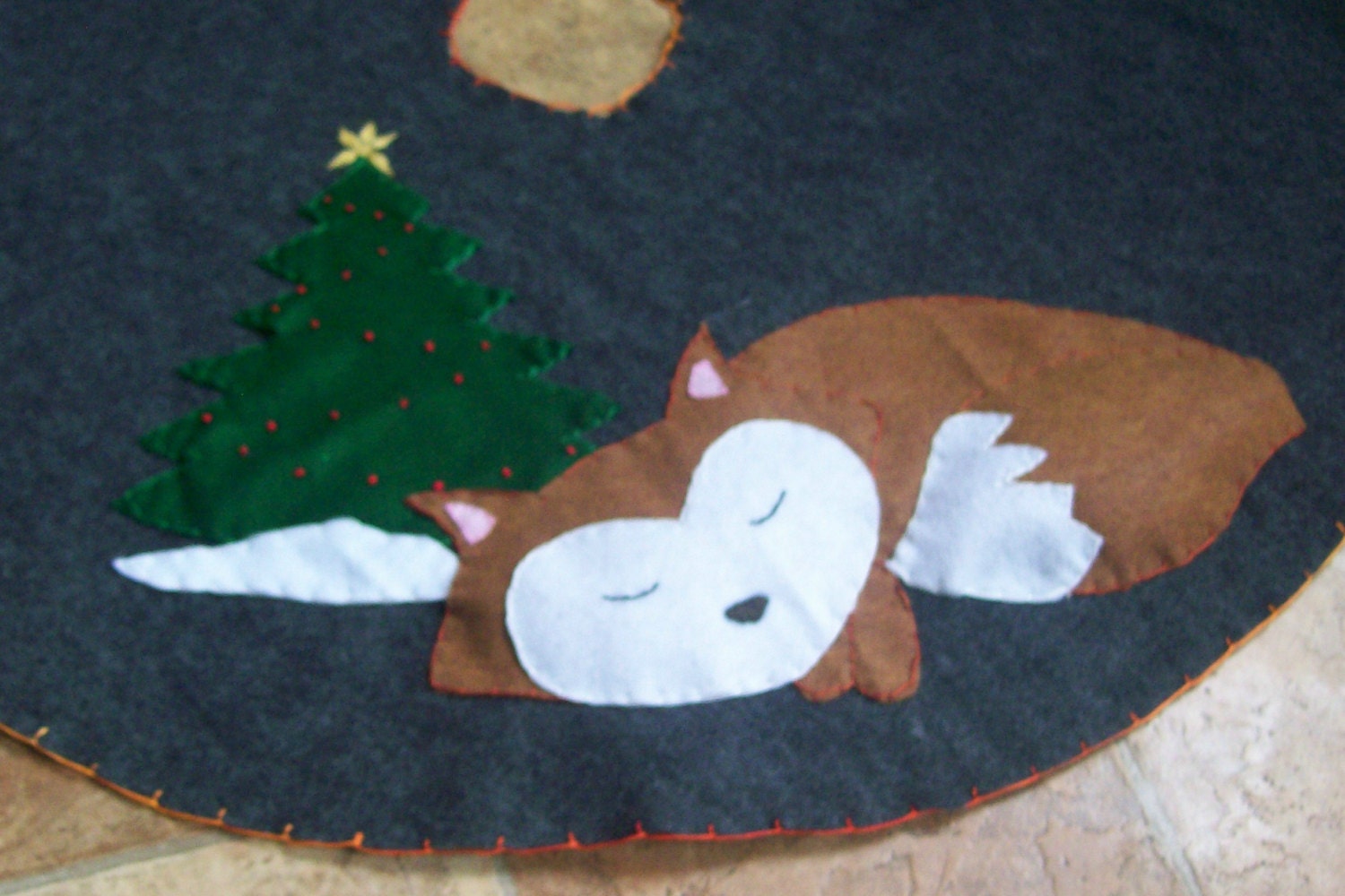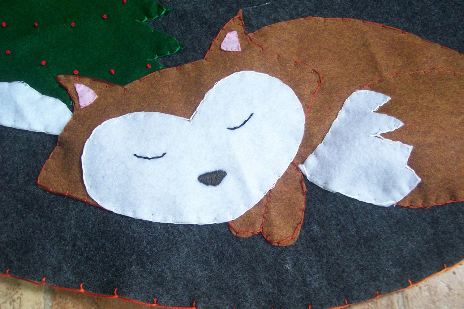 This little fox has found a peaceful place to sleep under your Christmas tree. This tree skirt is made of felt with a hand sewn and embroidered sleeping fox by a Christmas tree. A little padding has been added to the fox face and, of course, bushy tail.