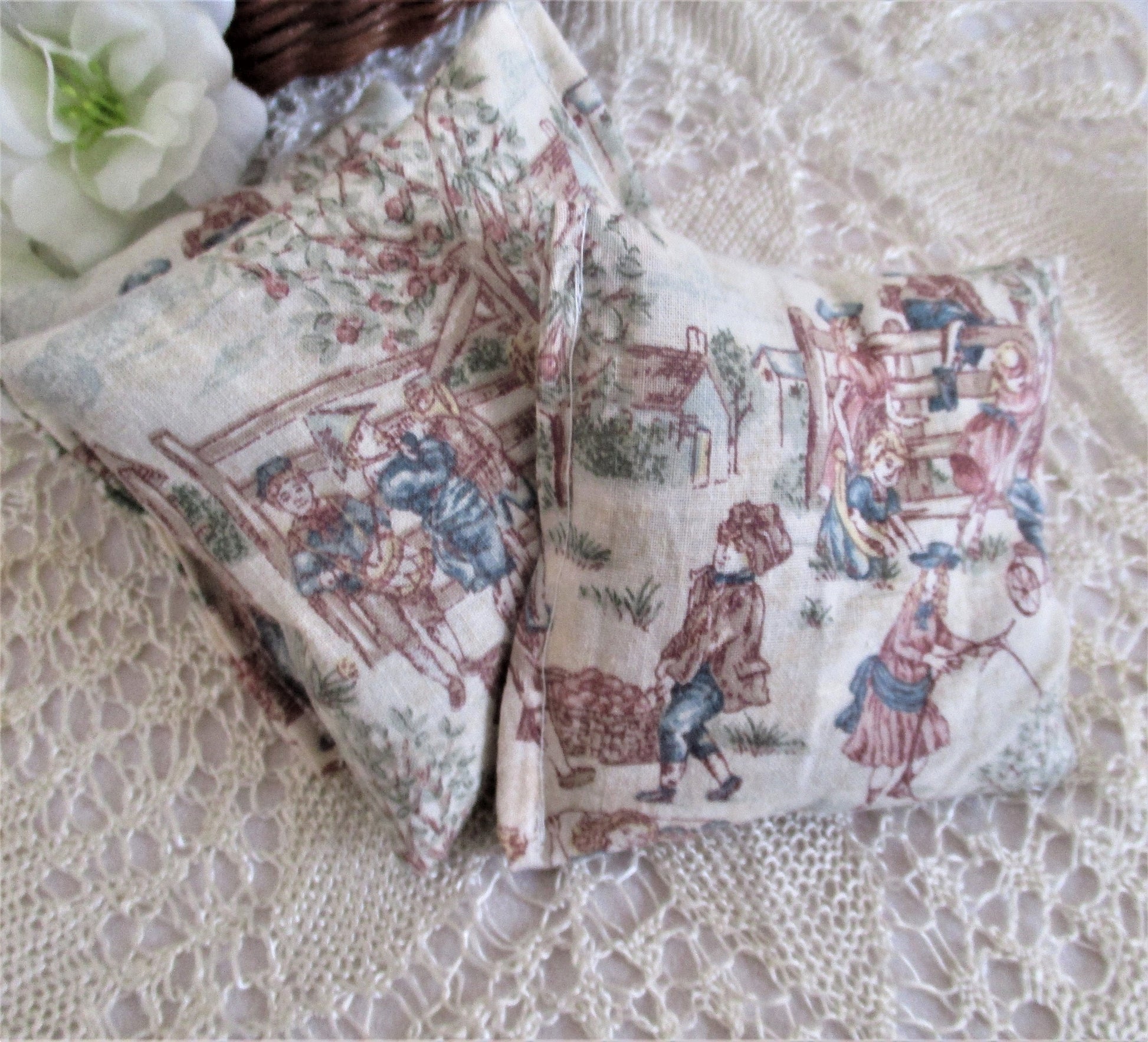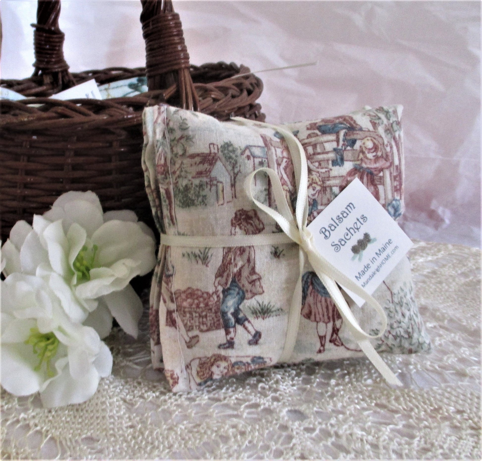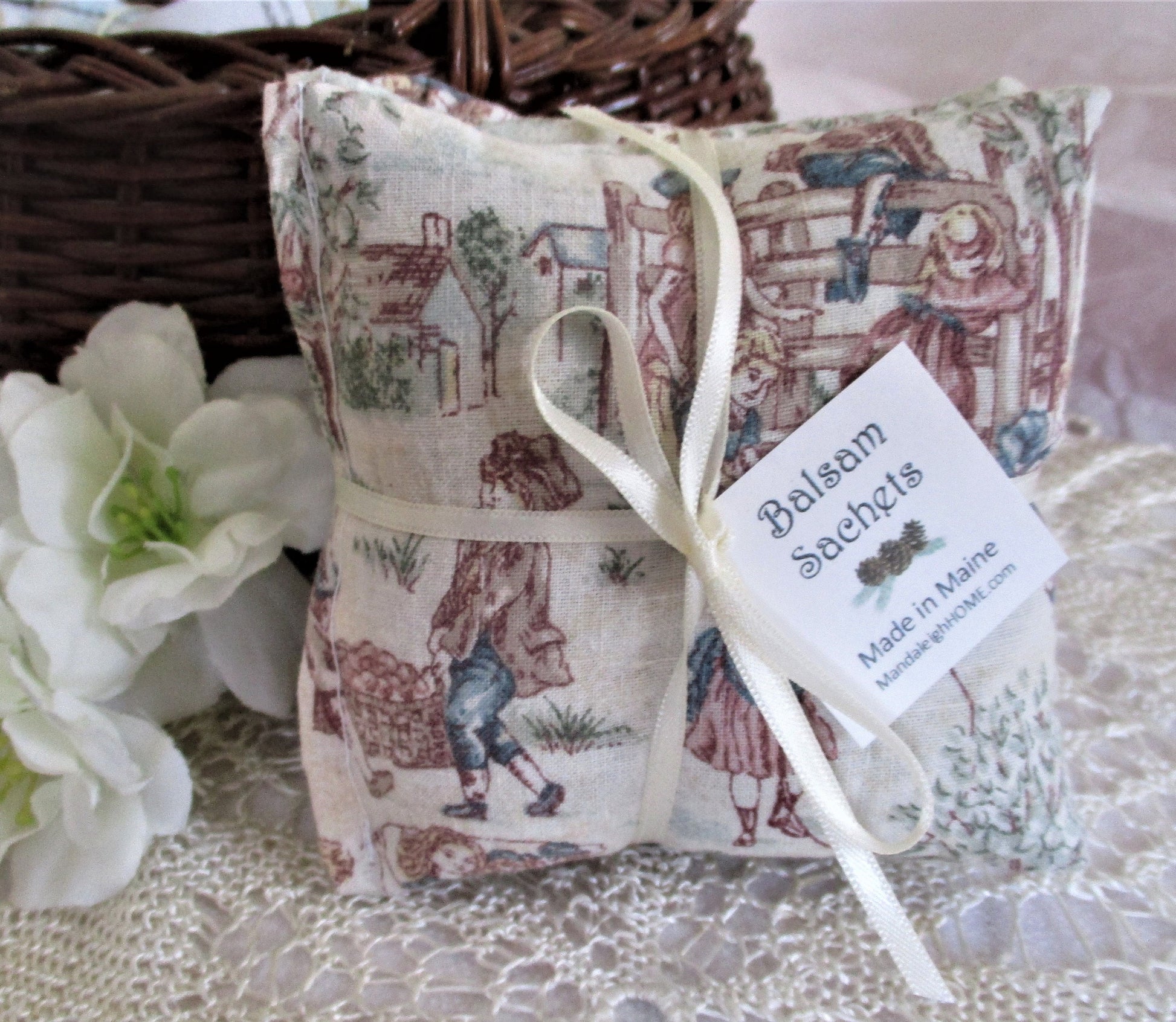 The fabric on these sachets is reminiscent of simpler times. It is a toile style fabric that depicts children of days gone by playing. This listing is for a set of 3 Sachets. Each sachet measures about 3 inches square, and is filled with Balsam, Lavender, Cedar, or a blend of your choice. Each set comes tied with a satin ribbon and a Maine Made tag... ready for gift giving!