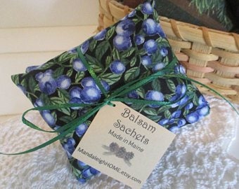 This listing is for either 75 individually packaged or 25 Sets of 3 Sachets in your choice of Balsam or Lavender. Each sachet made with various blueberry fabrics is filled with 100% Natural Dried Balsam or Lavender and measures about 3 inches square. Each sachet or set of 3 is tied with satin ribbon and a hang tag, ready to stock on store shelves, or give as gifts to co-workers, friends, and the post man that brought you this order!